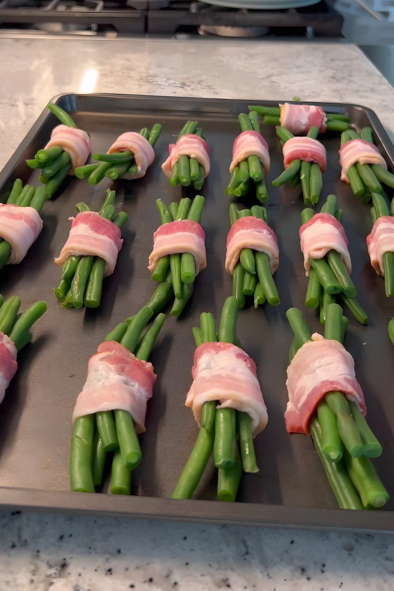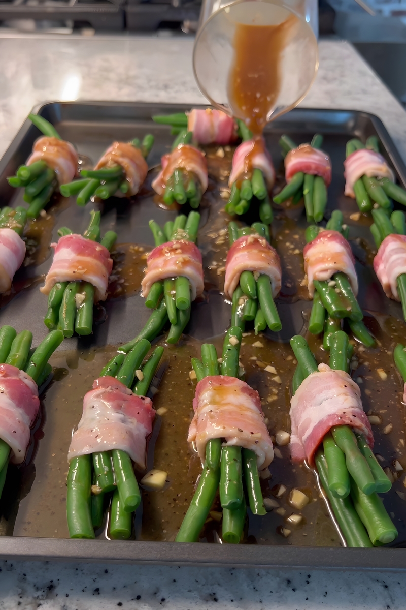 - Preheat your oven to 400°F (200°C). Use a spoon to drizzle or pour the prepared glaze evenly over the top of the bacon-wrapped green bean bundles. Make sure every bundle gets coated generously for maximum flavor. Place the baking sheet in the preheated oven and bake for 25 minutes, until the bacon is crispy and the green beans are tender.