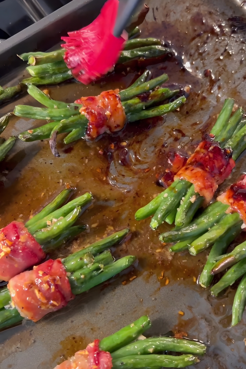 - After about 12-15 minutes, remove the baking sheet from the oven and carefully baste the bundles with the glaze that has pooled at the bottom of the pan. This extra step ensures that the bacon stays moist and infuses more of that delicious sweet-savory flavor into each bite. Return the bundles to the oven and continue baking until the bacon is perfectly crisp.
