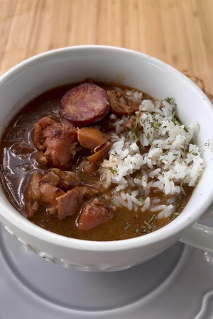 - Once the gumbo is cooked down and all the flavors have melded together, it’s time to serve. Ladle the thick, savory gumbo over a generous scoop of cooked white rice. Garnish with dried parsley or thinly sliced green onions for a touch of freshness. Grab a spoon, dig in, and savor the hearty goodness that’s bursting with flavor.