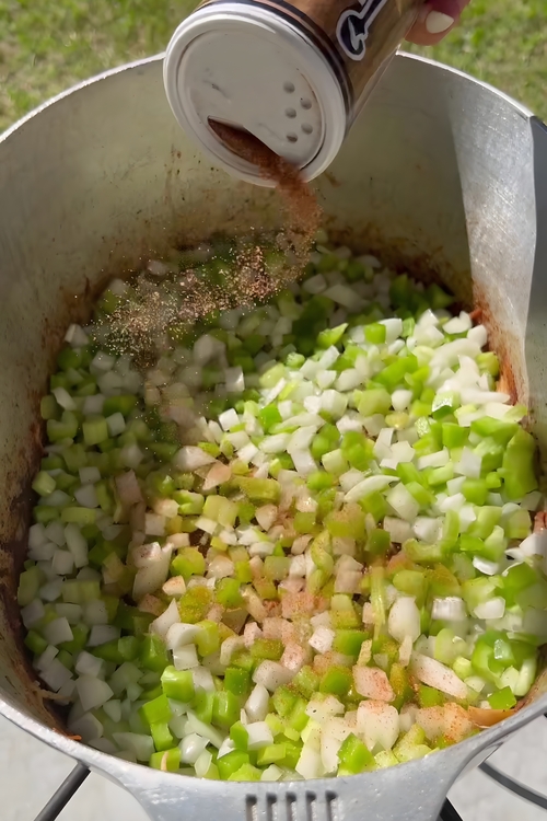 - In the skillet, add the holy trinity of Cajun cooking—one large diced onion, one large diced bell pepper, and three stalks of diced celery. Season the vegetables with another pinch of Cajun seasoning and sauté until they become tender, about 8-10 minutes. Once the vegetables are softened, add three to four cloves of minced garlic and sauté for another minute until fragrant. This layer builds the essential foundation of flavor for your gumbo.