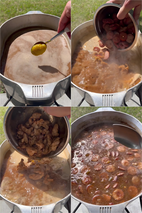 - Carefully add the prepared dark roux to the vegetables, stirring constantly to blend the roux and veggies. Gradually pour in four cups (950 ml) of chicken stock and an additional four cups (950 ml) of water while stirring. To boost the flavor, add one tablespoon of Better than Bouillon Chicken Base. Bring the mixture to a boil, then reduce to a gentle simmer. Let the gumbo cook for at least 30 minutes before adding the browned sausage and chicken back in. Remember, the longer it simmers, the richer the flavor will be—two to three hours of cooking is ideal.