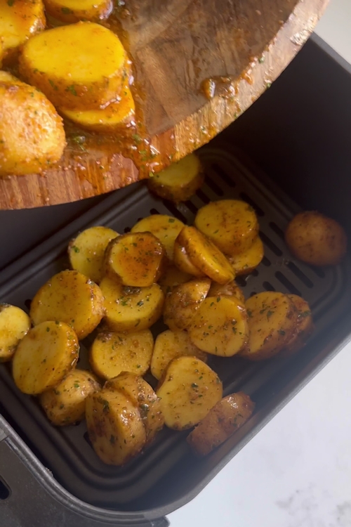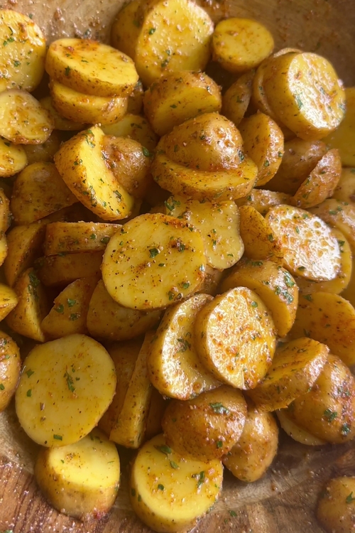 - To start, grab 450g (about 1 lb) of baby potatoes. You want to slice these in half to get that perfect balance of crispiness and soft texture. Add the sliced potatoes to a large mixing bowl, and drizzle them with 2 tablespoons of olive oil. Season the potatoes with 1 teaspoon paprika, 1 teaspoon garlic granules, 1 teaspoon onion powder, 1 teaspoon dried oregano, 1 teaspoon dried parsley, 1/2 teaspoon black pepper, and 1/2 teaspoon salt, or adjust as per your taste. Mix everything well to ensure each potato slice is coated in that delicious spice blend.