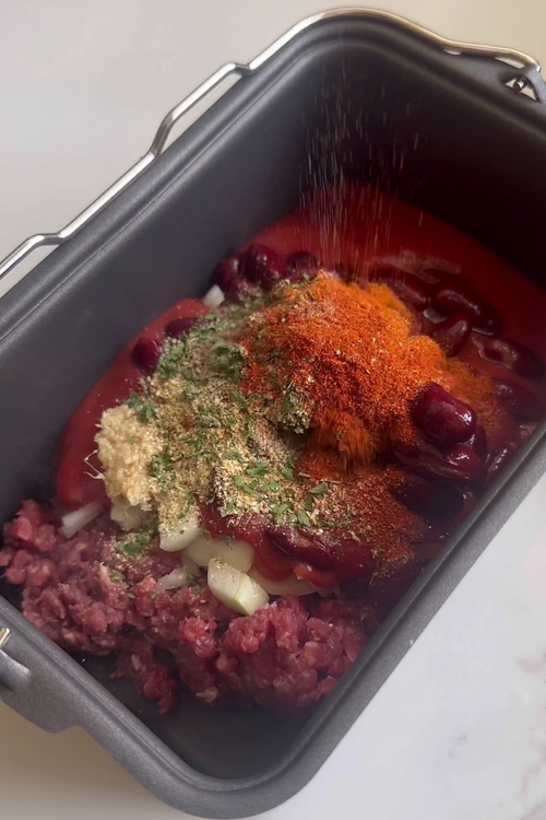- While the potatoes cook, let’s get started on the hearty chili. In the second basket of the air fryer or in the stew pot attachment, add 250g (about 0.5 lb) of ground beef. Add in 1 small onion, finely chopped, and 1 teaspoon of garlic paste. Then, pour in 250 ml (1 cup) of tomato passata and 125 ml (1/2 cup) of water. To add more flavor, include 200g (7 oz) of kidney beans, 1/2 teaspoon garlic powder, 1/2 teaspoon onion powder, 1 teaspoon paprika, 1/2 teaspoon red chili powder (optional for some heat), 1 teaspoon dried oregano, 1 teaspoon dried parsley, 1/2 teaspoon black pepper, and 1/2 teaspoon salt.