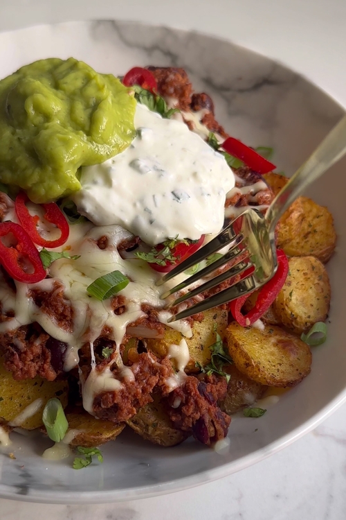 - Once both the potatoes and the chili are done, it’s time to load them up! Lay the crispy potato halves onto a serving platter, and generously spoon the hot chili over the top. To take it up a notch, sprinkle with some shredded mozzarella cheese. Let it melt slightly from the heat of the chili. Garnish with chopped spring onions, a few slices of red chili for an extra kick, and freshly chopped coriander for brightness. For a final touch, add dollops of sour cream and guacamole, which provide the perfect creamy contrast to the rich, spicy chili.