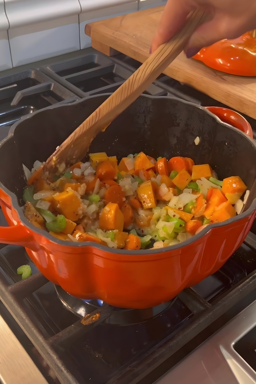 - To start, melt 1 stick of high-quality butter (115g) in a Dutch oven over medium heat. Add in 1 small diced onion, 2 chopped celery stalks, 2 chopped carrots, and 1 small diced sweet potato. Sauté these vegetables for around 5-7 minutes until they begin to soften, and their natural sweetness starts to develop. Add 2 cloves of minced garlic and 1 tablespoon of garlic & herb seasoning, and continue cooking for 2 more minutes to let those wonderful aromatics bloom.