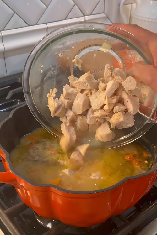 - Once the broth is well incorporated, add 1.5 lbs (700g) chicken breast to the pot along with 2 bay leaves. Bring the mixture to a gentle boil, then reduce to a simmer. Allow the chicken to cook for about 10-15 minutes, or until it’s cooked through and easy to shred. Remove the chicken from the pot and use two forks to shred it, then return the shredded chicken to the pot, ensuring every bite of soup is filled with tender pieces of chicken.