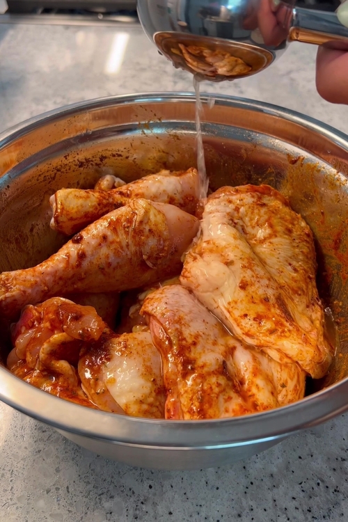 - In a large bowl, combine 5 pounds (2.27 kg) of chicken legs and thighs (bone-in) with 1/2 cup (120 ml) of Newman’s Own Garlic Vinaigrette & Marinade. Add 1 tablespoon (15 g) of paprika, 1 tablespoon (15 g) of Cajun seasoning, and 1 tablespoon (15 g) of garlic and herb seasoning. Squeeze in the juice from half of a lemon, ensuring the marinade coats each piece of chicken evenly. If you find any piece lacking in coverage, add a bit more marinade. Cover the bowl with plastic wrap and refrigerate for at least an hour, preferably longer, to let the flavors infuse deeply into the meat.