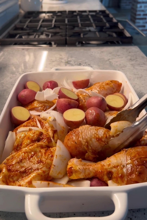 - Preheat your oven to 425°F (220°C). While the oven heats up, prepare a baking dish that will comfortably fit all the chicken pieces. Arrange the baby red potatoes (quantity as preferred), cutting them in halves if they are larger, along with one yellow onion, thinly sliced. These vegetables will absorb the rich flavors from the chicken juices, becoming tender and delicious.