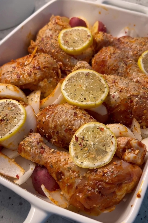 - Take the marinated chicken out of the refrigerator. Nestle the chicken pieces on top of the potatoes and onion slices in the baking dish, ensuring that the vegetables are well spread out to evenly cook beneath the chicken. Top each piece of chicken with thin slices of the remaining half lemon for an extra zesty punch. Sprinkle a little more garlic and herb seasoning over everything to enhance the overall flavor. Bake in the preheated oven for 45 minutes or until the chicken reaches an internal temperature of 165°F (74°C) and has a golden-brown, crispy skin. The juices from the chicken will mingle with the potatoes and onions, giving the entire dish a rich, savory flavor.