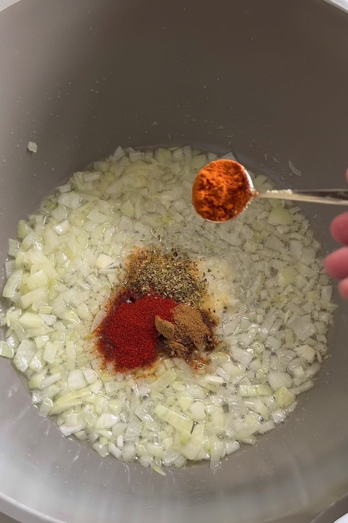 • Start by heating 3 tablespoons of oil in a large pot over medium heat. Dice one medium onion (about 150g) and sauté it in the oil for 2-3 minutes until softened. Add 1.5 teaspoons of garlic paste or 4 minced garlic cloves, followed by 2 teaspoons of onion powder, 1 teaspoon of garlic powder, 2 teaspoons of oregano, 1 teaspoon of ground cumin, 2 teaspoons of paprika, 1 teaspoon of cayenne powder, and 1/2 teaspoon of black or white pepper. Stir the spices into the onions and garlic until fragrant, about 1 minute.