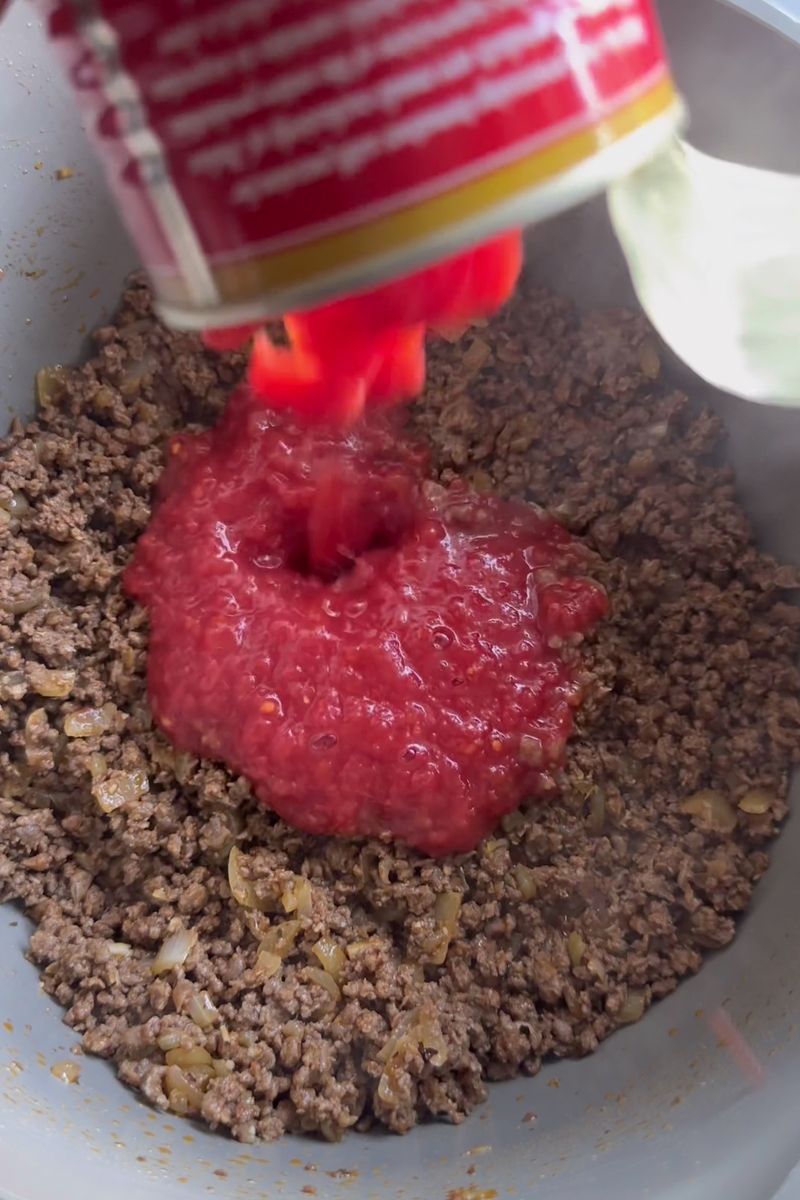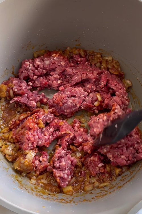 • Add 500g (1.1 lbs) of ground lamb or beef to the pot. Use the back of a spoon to break the meat into small pieces as it browns. Continue cooking on medium-high heat for about 10 minutes, stirring occasionally. Once browned, mix in 1 tablespoon of Worcestershire sauce to deepen the flavor.