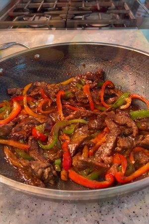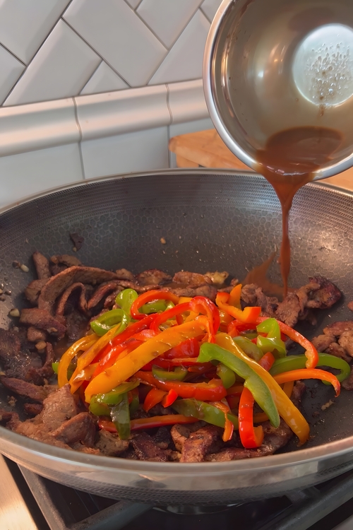 - Add the cooked bell peppers back into the wok with the steak, and pour in the prepared sauce. Stir everything together until the peppers and steak are well-coated. Allow the sauce to come to a simmer, which should take about 2 to 3 minutes. As it simmers, it will thicken and become glossy, coating each piece of steak and pepper in savory goodness. Once the sauce has thickened, remove the wok from the heat.