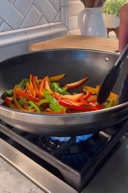 - Start by thinly slicing one red, one green, and one orange bell pepper. These bell peppers will add both color and sweetness to the dish. Heat a wok or a large skillet over medium-high heat and add one tablespoon (15 ml) of olive oil. Once the oil is shimmering, add the sliced bell peppers and sauté them for about 3 to 4 minutes, or until they begin to soften slightly. The goal is to achieve a balance where the peppers maintain a little crunch, yet become tender enough to soak in the savory flavors later on.
