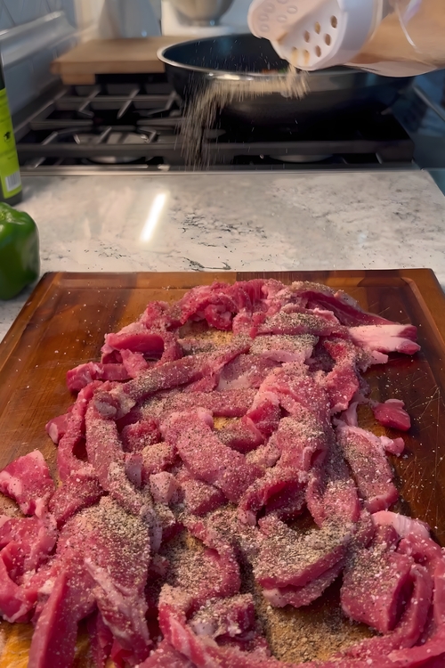 - While the peppers are cooking, grab a thin-cut ribeye steak (about 1 lb or 450 g). You could also use flank steak or any tender cut you prefer. Slice the steak thinly, against the grain, to ensure tender bites in every mouthful. Season the steak generously with garlic salt, a pinch of black pepper (roughly 1/2 teaspoon or 2.5 g), and a bit of onion powder (1/2 teaspoon or 2.5 g). Mix everything well so that the seasoning evenly coats each piece of steak. This seasoning will serve as the foundation for the flavors in your dish.