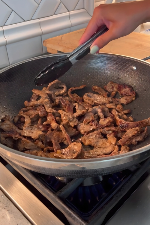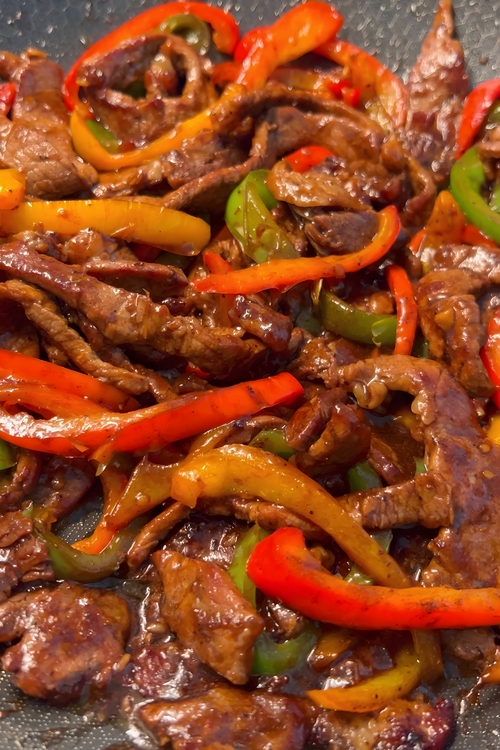 - Once the bell peppers are done, transfer them to a plate. Add another tablespoon (15 ml) of olive oil to the wok and let it heat up. Add the sliced steak in batches to avoid overcrowding, which helps achieve that perfect sear. Cook the steak for about 2 to 3 minutes per side, or until it has a nice light brown color. When all the steak has a beautiful sear, add 2 tablespoons (30 g) of minced garlic. Stir-fry until the garlic becomes fragrant, which will only take about 30 seconds.