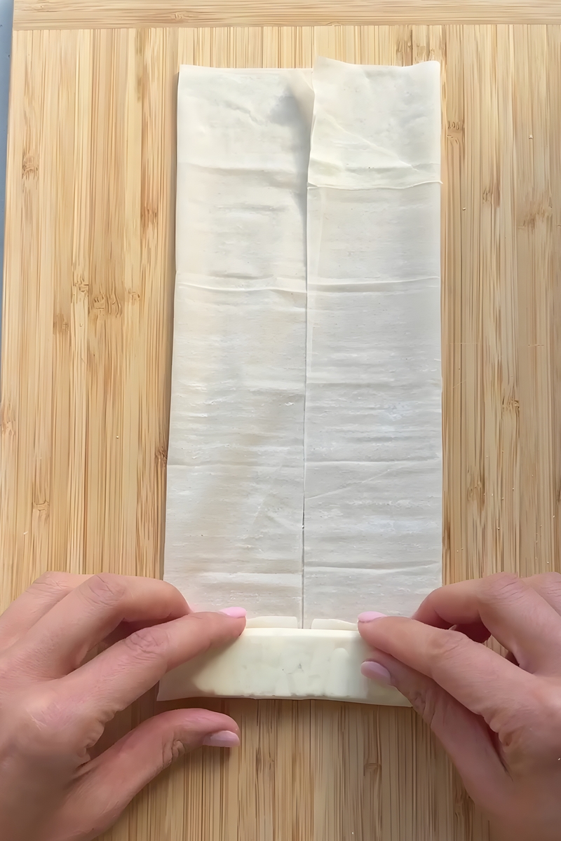 • Lay out one sheet of phyllo dough on a clean, dry surface. Place a piece of feta cheese near one edge of the sheet. Gently fold the phyllo over the feta, tucking in the sides like wrapping a small package. Continue rolling until the feta is fully enclosed. Repeat this process with the remaining feta planks and phyllo sheets.