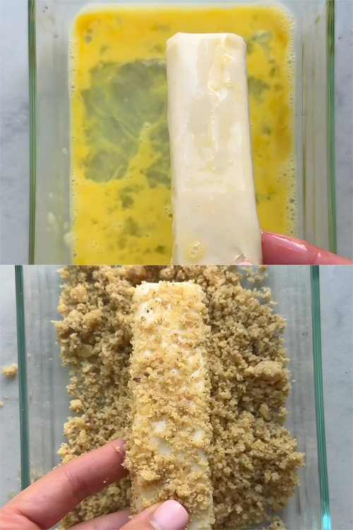 • Dip each phyllo-wrapped feta plank into the beaten egg wash, ensuring all sides are evenly coated. Then, roll the plank in the finely chopped walnuts, pressing gently so the walnuts adhere to the phyllo surface. This walnut coating adds a delightful crunch and enhances the flavor profile of the dish.
