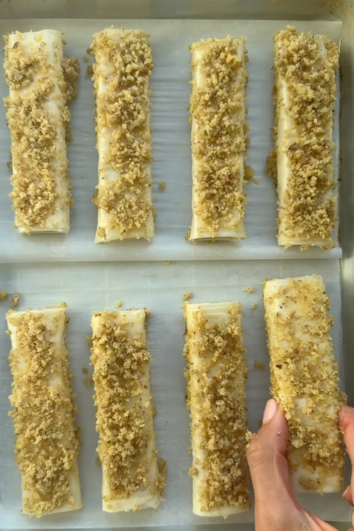To make this recipe nut-free, substitute walnuts with sesame seeds or panko crumbs. For a gluten-free version, use gluten-free phyllo dough.
