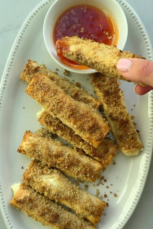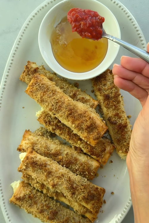 • Once the phyllo-wrapped feta is out of the oven, allow it to cool for a few minutes. Arrange the golden, crispy planks on a serving platter alongside the honeyharissa dip. Serve warm and watch them disappear in no time!