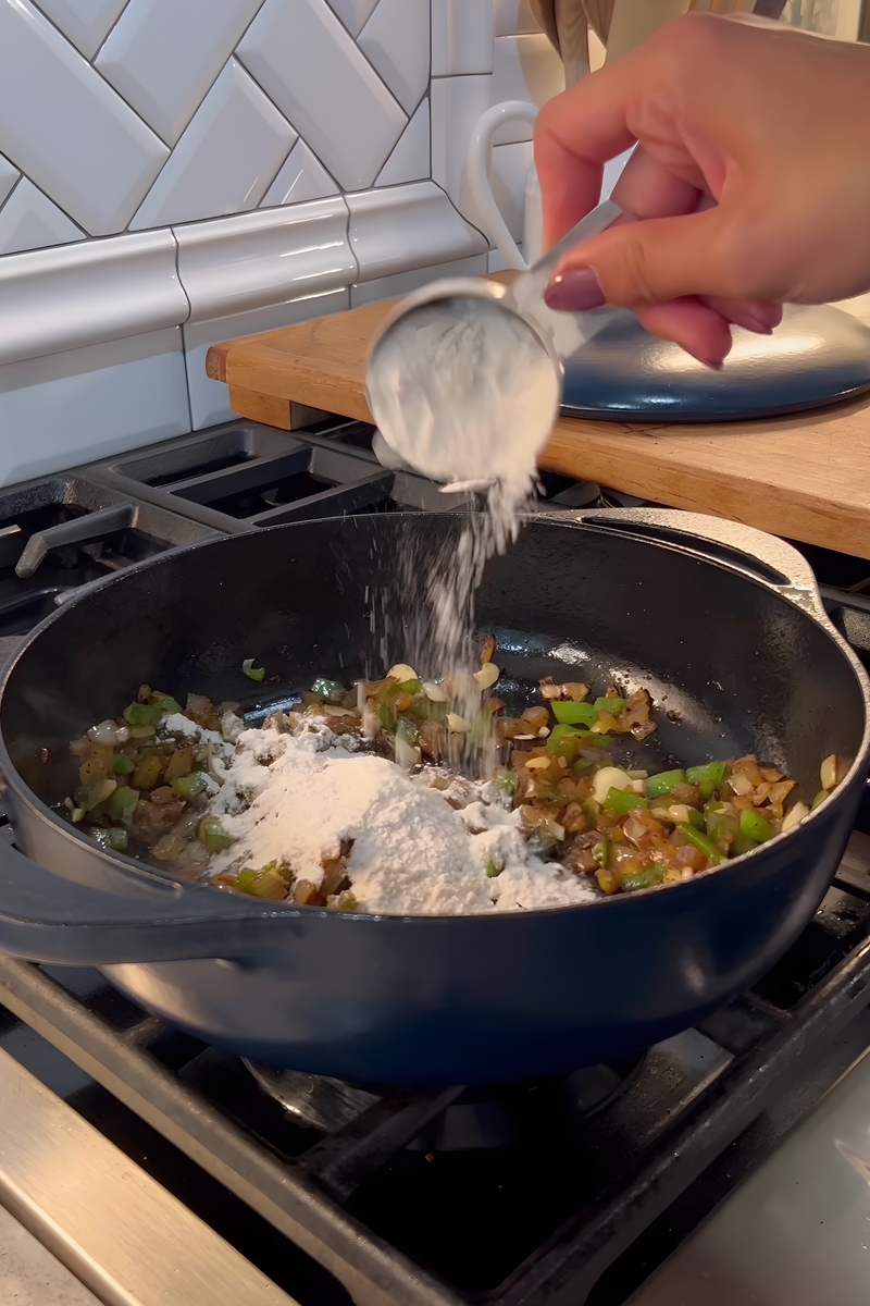 - Once the onion, bell pepper, and garlic have softened, sprinkle in 1/4 cup of all-purpose flour. Stir well to coat all of the vegetables evenly, allowing the flour to cook for about 1-2 minutes. This step is crucial to get rid of any raw flour taste and to form the roux that will thicken your gravy.