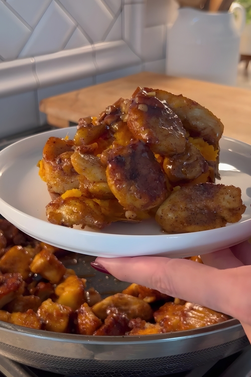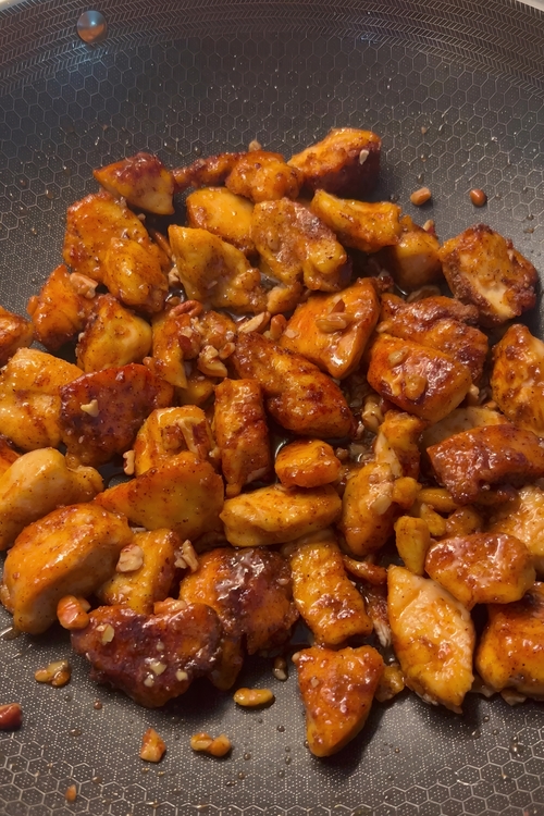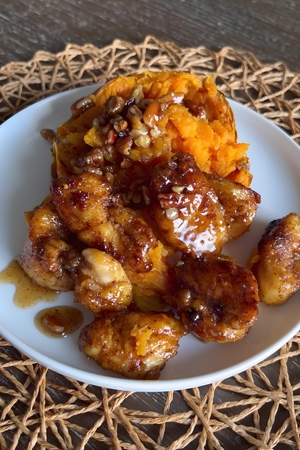 • Once the chicken is fully coated in the praline glaze, transfer it to a serving platter. Serve immediately while hot, alongside roasted sweet potatoes, steamed vegetables, or a fresh green salad. Enjoy the perfect blend of sweet, spicy, and crispy flavors that make this dish truly unforgettable.