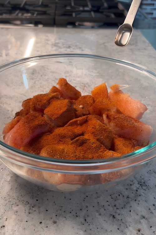 • Start by cutting 2 pounds (0.9 kg) of boneless, skinless chicken breast into bite-sized pieces. In a mixing bowl, season the chicken with 1-2 teaspoons of Cajun seasoning, 1 teaspoon of garlic powder, 1/2 teaspoon of black pepper, 1/2 teaspoon of paprika, and 1/4 teaspoon of cayenne pepper. Toss the pieces well to ensure an even coat of these aromatic spices, giving your chicken the flavorful kick that makes this dish so delicious.