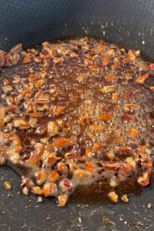 • In a medium saucepan, combine 1/2 cup (100 grams) of brown sugar with 1/3 cup (80 ml) of water over medium heat. Stir until the sugar is completely dissolved and begins to bubble. Next, add 1/4 cup (60 ml) of dark corn syrup, stirring it into the mixture until everything is smooth. Allow the syrup to bubble gently for about a minute before adding a handful of chopped pecans (roughly 50 grams). Let the pecans simmer in the mixture for another minute, then turn off the heat.