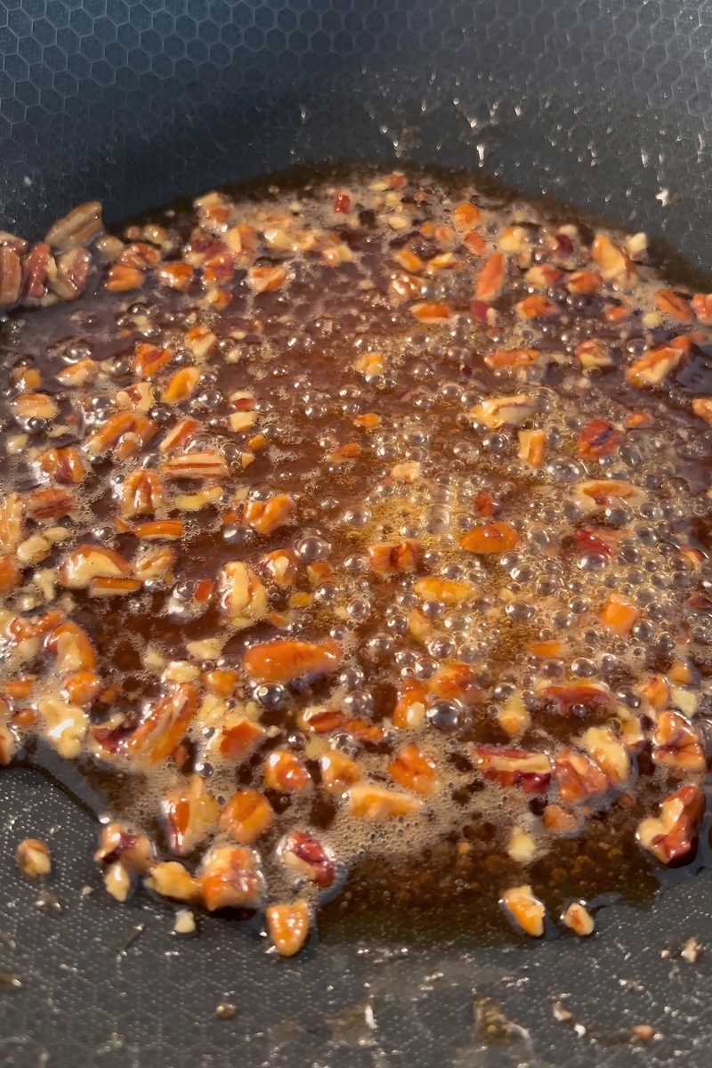 - In a medium saucepan, combine 1/2 cup (100 grams) of brown sugar with 1/3 cup (80 ml) of water over medium heat. Stir until the sugar is completely dissolved and begins to bubble. Next, add 1/4 cup (60 ml) of dark corn syrup, stirring it into the mixture until everything is smooth. Allow the syrup to bubble gently for about a minute before adding a handful of chopped pecans (roughly 50 grams). Let the pecans simmer in the mixture for another minute, then turn off the heat.