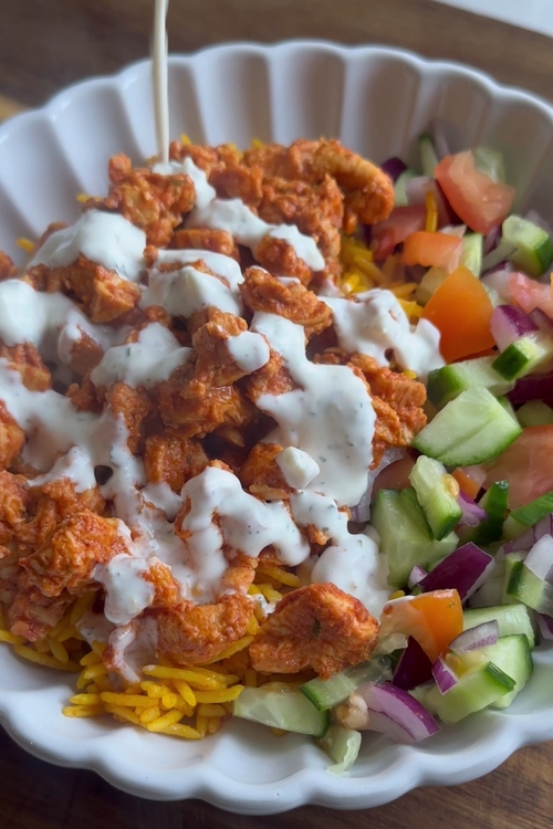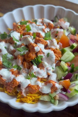 - Layer your plate with a generous serving of spiced rice, followed by the juicy chicken pieces. Drizzle the creamy garlic sauce over the top and garnish with fresh parsley or cilantro if desired. Serve with a side salad or grilled vegetables for a balanced meal.