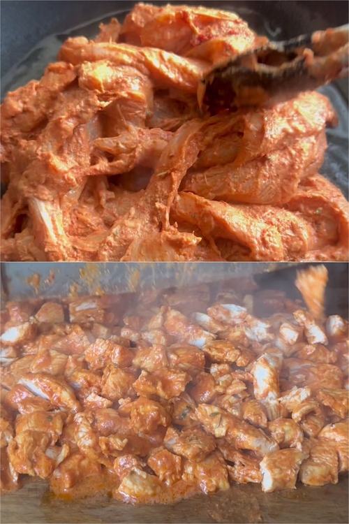 - To achieve the signature flavor of this dish, start by marinating 650g (1.43 lbs) of chicken tenders, breast, or thigh pieces. Combine 2 tablespoons of yogurt, 1 tablespoon of garlic-ginger paste, and the juice of half a lemon (around 1 tablespoon). Mix in 1 tablespoon of tomato puree, 2 teaspoons of Kashmiri red chili powder, 1 teaspoon each of paprika, onion powder, ground cumin, ground coriander, oregano, and salt (adjust to taste). Let the chicken marinate for at least 30 minutes or, for the best flavor, refrigerate it overnight.