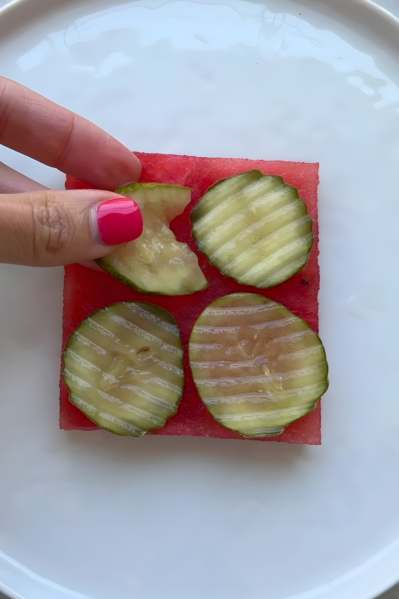 - Take 2-3 slices of your favorite pickles (about 20-30 g) and lay them evenly across the watermelon slice. Opt for sweet bread-and-butter pickles for a balanced flavor or tangy dill pickles for a zesty kick.