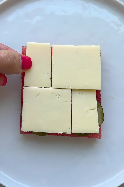 - Begin by slicing a large, seedless watermelon into a thick, round slice about 1 inch (2.5 cm) thick. Trim away the rind carefully to create a flat, sandwich-like layer. Pat it dry with a paper towel to remove excess moisture, which helps other ingredients adhere better.